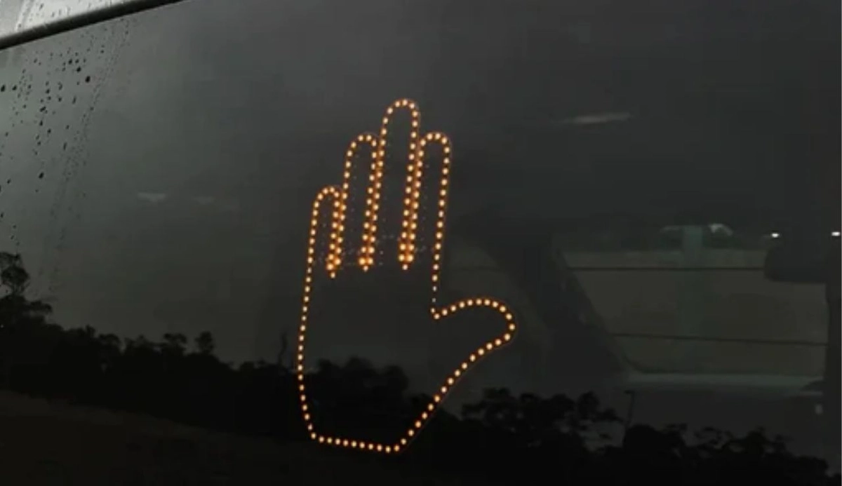 A iluminação em LEDs vermelhos é que permite a visualização de três formatos diferentes. O primeiro é uma mão em formato de parada, como uma espécie de pedido de desculpas ou cumprimento. A segunda opção é o famoso hang loose, também conhecido como sinal do Ronaldinho, e pode ser usado para agradecer outros motoristas ou pedestres.
