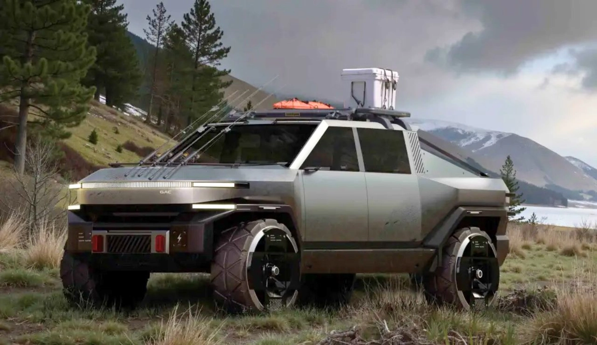 Apesar da semelhança com a picape da Tesla, o modelo da GAC tem personalidade, equipado acessórios off-road presentes para-choques reforçados, rack de teto, santantônio geométrico e rodas imponentes pintadas em preto brilhante, calçadas com grandes pneus chamativos.