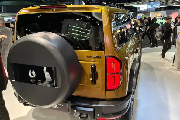 Na parte de trás, as lanternas de LED são posicionadas de forma vertical. A tampa do porta-malas tem a abertura feita na horizontal, assim como ocorre no Ford Bronco e em seu rival H9. Há ainda um suporte de roda sobre a tampa do porta-malas.