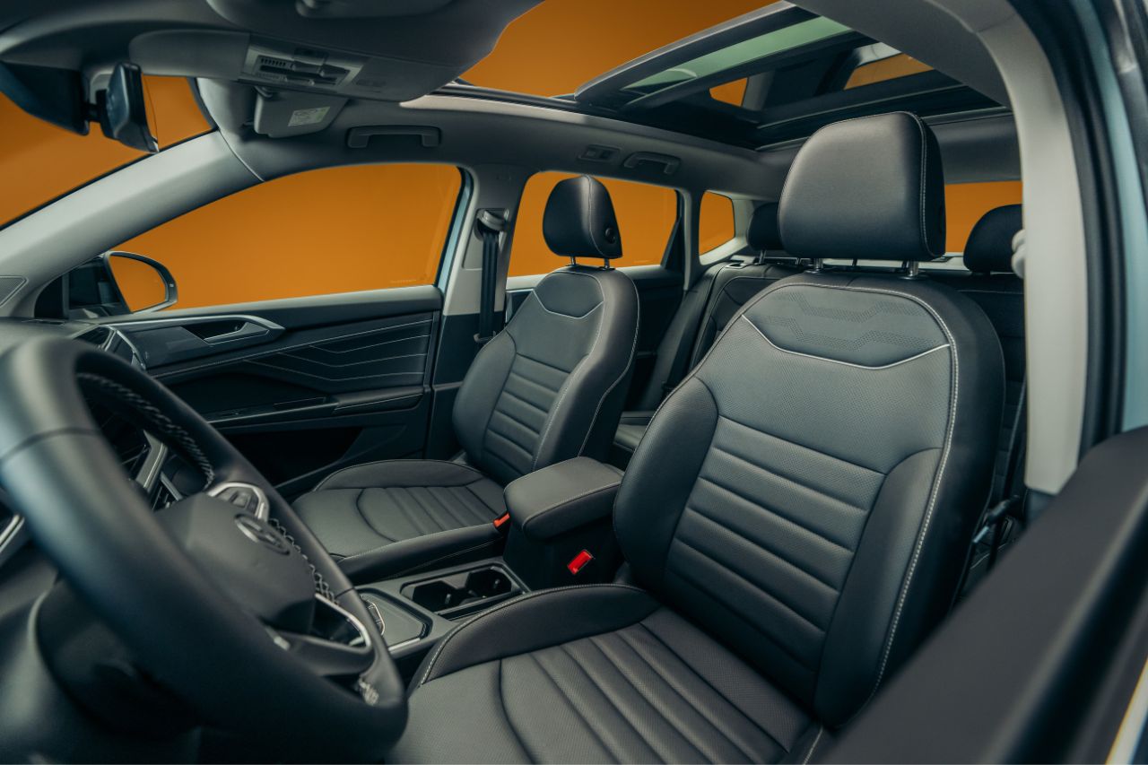 A parte interna não muda tanto, e o modelo segue com mesmo volante multifuncional, painel de instrumentos de 10,25 polegadas, central multimídia de 10,1 polegadas, bancos e console central. Tem material macio ao toque nas portas e painel frontal, que muda e ganha novo visual.